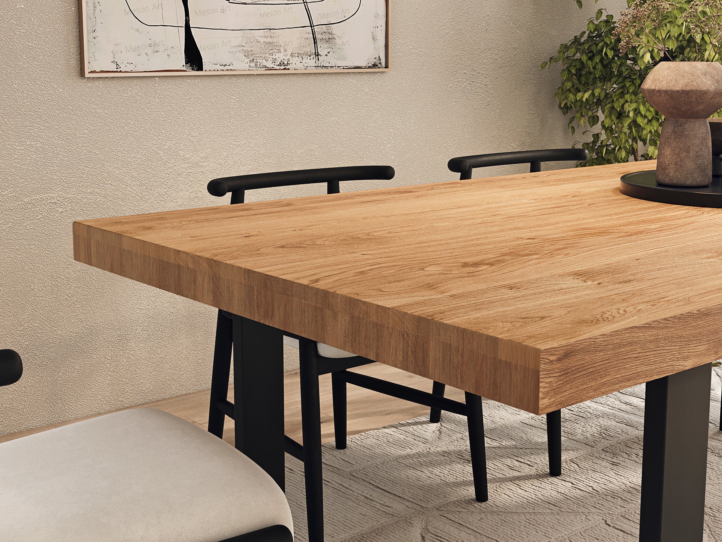 Ten stół z litego dębu to hołd dla natury. Jego funkcjonalne usłojenie i naturalne wykończenie, że jest nie tylko przedmiotem, ale także funkcjonalnym dziełem sztuki